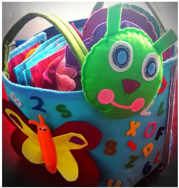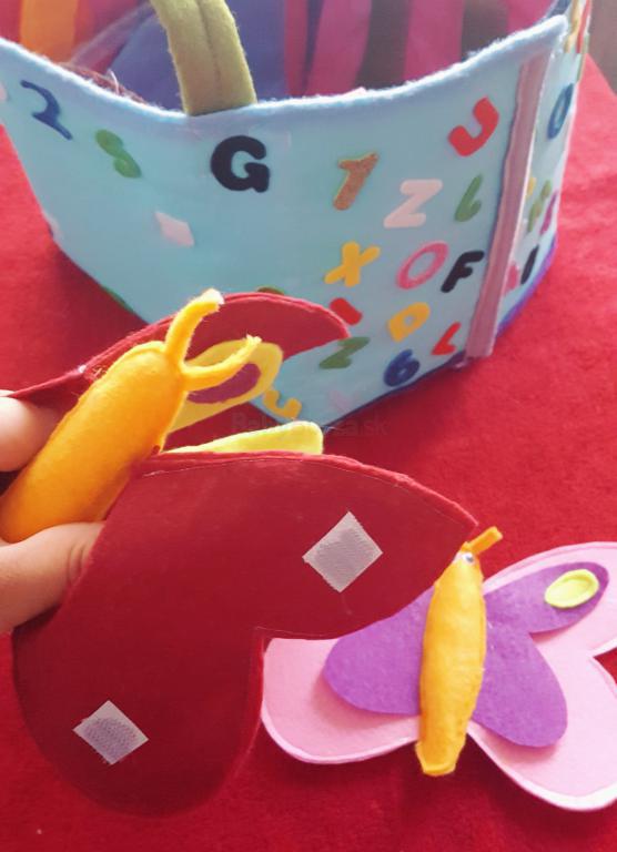 Vlastne vyrobená, šitá, kreativna hračka pre deti od 3 do 6 rokov. Rozmery tašky: 25x25x25 cm. Video: Facebook: PlayingandLearning Quietbox